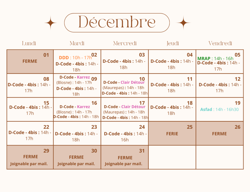 La permanence du D-Code a lieu au 4bis du lundi au vendredi. L’accueil est confidentiel et gratuit, avec ou sans rendez-vous.