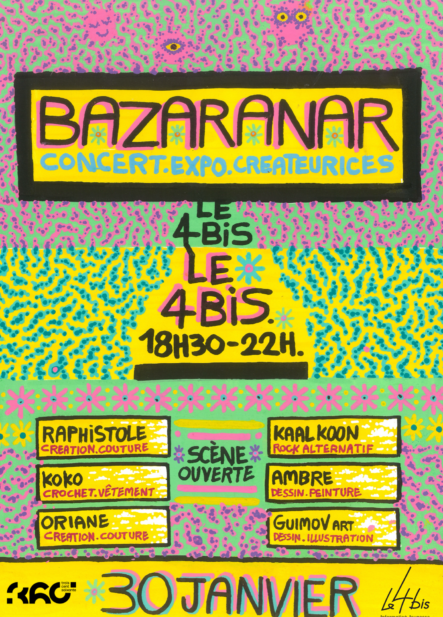 Le BAZARANAR est un événement ouvert à toutes et tous, organisé au 4bis, le vendredi 30 janvier 2026, regroupant artistes peintres, dessinateur.ice.s, plasticien.ne.s, musicien.ne.s, couturier.e.s de la scène Rennaise, sur les thèmes vintage, inclusivité, arts & autoproduction.